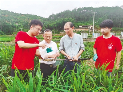 上杭县通贤镇以永宝萝卜专业合作社为依托,创建获评上杭萝卜科技小院,由福建农林大学4名专家、8名研究生组成的专家团队常驻小院,随时下田间地头指导种植户,及时解决种植过程中遇到的难题。图为近日,福建农林大学教授钟凤林带着研究生,对萝卜轮作的前茬作物生姜的种植地进行土壤样品的采集以及初步分析。 融媒体记者 阙林福 陈珊珊 摄