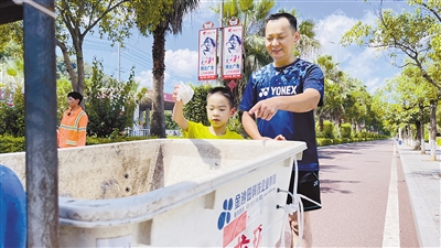 家长带孩子参加义务创城,捡拾路面垃圾。