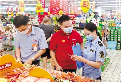为助力文明城市创建,龙岩市、新罗区两级市场监管部门成立夜查组,执法人员深入一线,分区划片开展错时专项巡查。图为近日,执法人员在某超市开展执法检查。