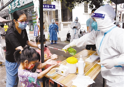 8月11日,在三亚市天涯区南边海渔村,河南省援海南三亚医疗队的医护人员原清怡为群众消毒。为充实海南三亚的防疫力量,全国各地组建的医疗队陆续抵达三亚,加入到三亚的抗疫工作中。 新华社记者 赵颖全 摄