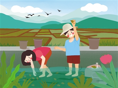 除了田间,清澈的水渠里也会有很多小小的尖尖的石螺。而暑假,正是摸田螺的好时节。