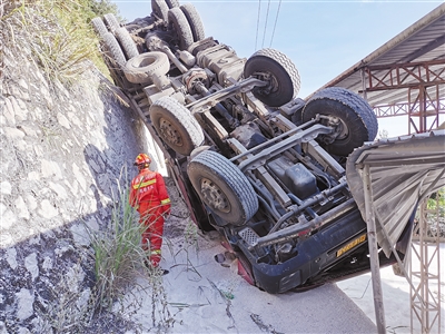 据现场侦查和向知情人士了解,该事故车辆为运载块状石灰的“后八轮”,总重约有30吨,在厂区外围辅路上行至卸货点的缓坡途中发生倒溜,倒溜后车辆“四脚朝天”翻落在辅路下方5米处的平台上,且车头重重地倒扣在平台和下方钢结构厂房顶棚上,前挡玻璃已完全掉落,司机被困在驾驶室内。