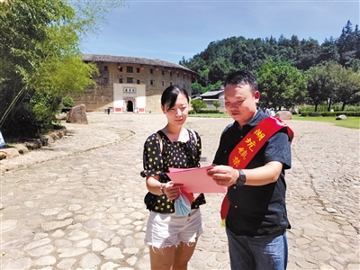 8月24日,永定区湖坑镇洪坑村组织志愿者深入辖区开展禁毒宣传活动。志愿者深入人员密集场所,通过发放宣传手册、宣传单的方式向群众介绍毒品的种类、危害以及防范方法等禁毒安全知识,向群众讲解因吸毒造成家破人亡的醒目案件,让广大群众深刻认识毒品对个人、家庭及社会的严重危害,呼吁大家远离毒品、珍爱生命,积极参与禁毒行动,共同构建和谐社会。图为志愿者向游客做宣传。 通讯员 黄秋萍 摄