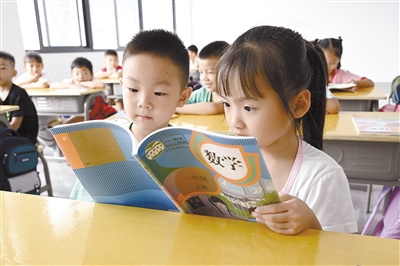 9月1日,龙岩市实验小学锦山校区一年级新生在翻看新修订的数学课本。