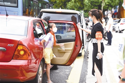 9月1日,龙岩市实验小学值日老师为家长车辆提供“开门服务”,提高通行效率。开学第一天,中心城区各中小学、幼儿园严格落实“护学岗”制度,共护校园周边交通安全与畅通。