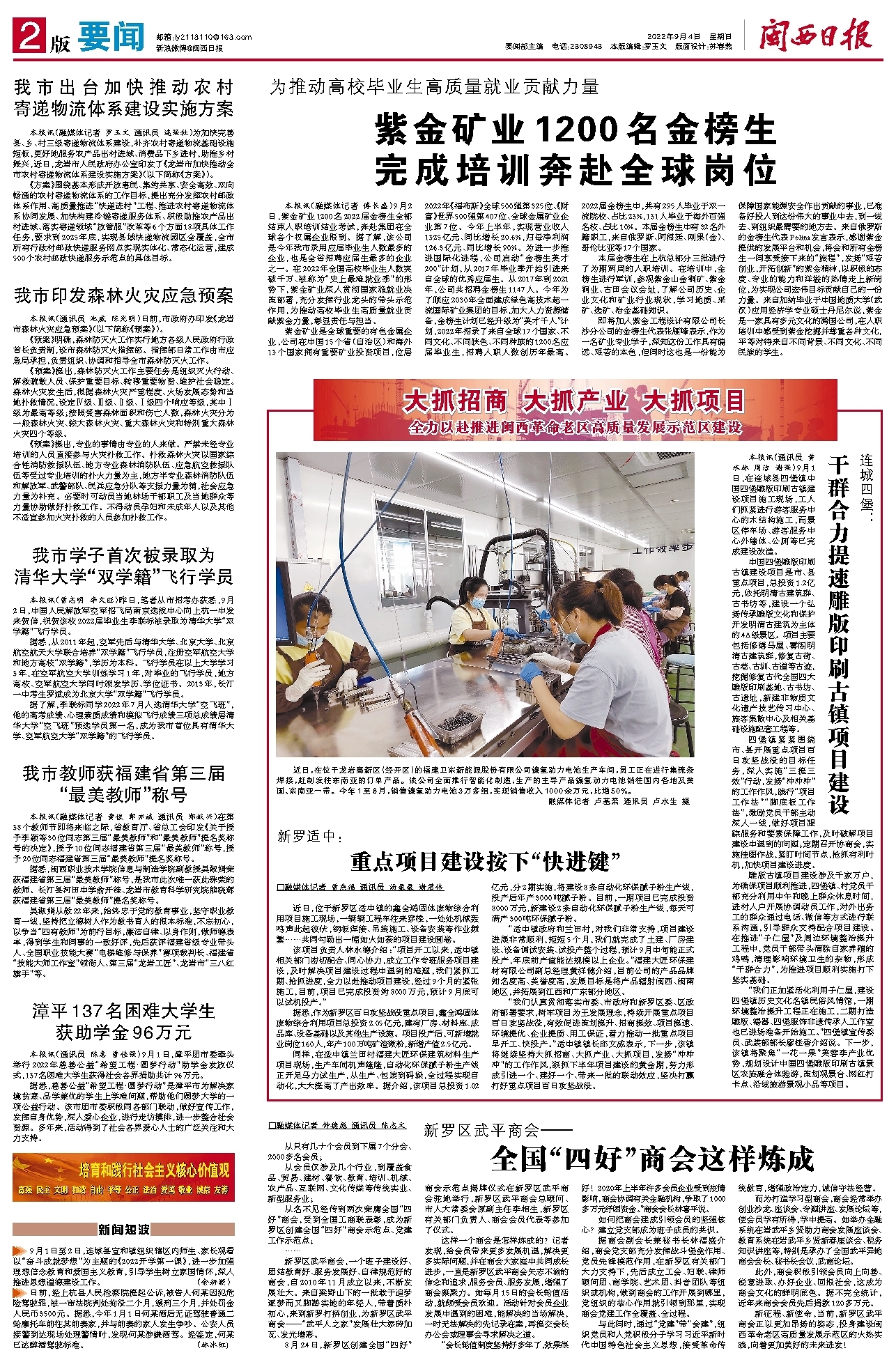 本报讯(融媒体记者 傅长盛)9月2日,紫金矿业1200名2022届金榜生全部结束入职培训结业考试,奔赴集团在全球各个权属企业报到。据了解,该公司是今年我市录用应届毕业生人数最多的企业,也是全省招聘应届生最多的企业之一。在2022年全国高校毕业生人数突破千万、被称为“史上最难就业季”的形势下,紫金矿业深入贯彻国家稳就业决策部署,充分发挥行业龙头的带头示范作用,为推动高校毕业生高质量就业贡献紫金力量,彰显责任与担当。