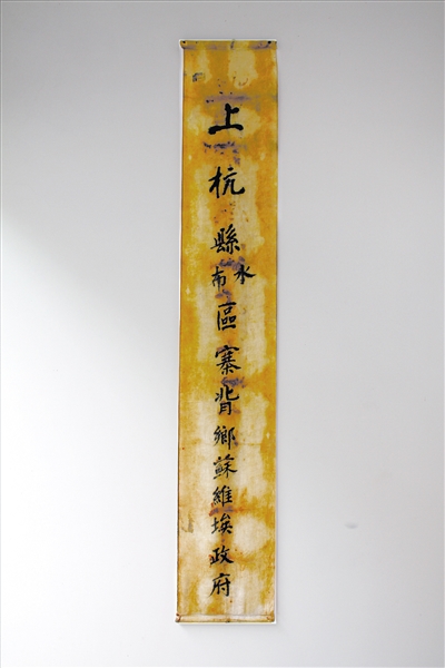 布牌为竖式楷书,纵长207厘米,横宽34厘米,两端各有一旗杆套,制作于1929年间,红丝绸布质地,呈红泛暗橘皮色泽。