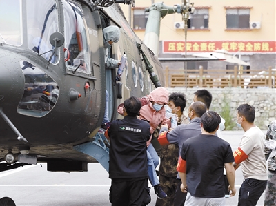 9月7日,首批从海螺沟搭乘直升机疏散出来的滞留人员抵达泸定县磨西镇。当日,从四川省海螺沟景区疏散的200余名当地群众、游客和工作人员等搭乘直升机抵达四川省甘孜州泸定县磨西镇。 新华社记者 沈伯韩 摄