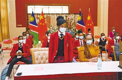9月6日,在纳米比亚首都温得和克的“天宫对话”活动纳米比亚分会场,一名学生向中国航天员提问。来自埃塞俄比亚、埃及等非洲8国的青少年6日通过网络视频与正在中国空间站执行任务的神舟十四号航天员进行“天宫对话”活动。当天活动的主会场设在位于埃塞俄比亚首都亚的斯亚贝巴的非洲联盟(非盟)委员会总部,并在阿尔及利亚、埃及、埃塞俄比亚、纳米比亚、尼日利亚、塞内加尔、索马里和南非共8个国家设立分会场,来自中非各界近千人出席。 新华社记者 陈诚 摄