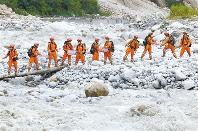 9月8日,在四川省甘孜州泸定县磨西镇附近,救援人员站在临时架设的小桥上向河对岸的村民运送生活物资。四川泸定地震发生后,震中磨西镇附近一些居住在山上的村民,因道路损毁未能全部撤出,只能在相对安全的开阔地带搭建临时安置帐篷。救援人员和志愿者沿着临时架设的过河小桥和开辟出的上山小路,通过肩背人扛,把饮用水、帐篷等物资送上山,为山上临时安置居民建立了一条供给线。新华社记者 沈伯韩 摄