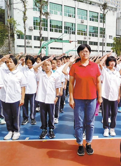 周一,李隽老师与学生们一起参加升旗仪式。