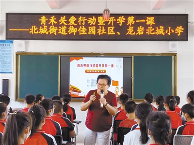 9月2日, 团市委联合新罗区北城街道御佳园社区居委会、龙岩市方圆社工服务中心于龙岩北城小学开展“青禾关爱行动暨开学第一课”之《未成年人保护法》宣讲活动,活动特邀请龙岩市中级人民法院原四级高级法官罗金钗为主讲,罗金钗以“关爱明天·‘未’你守护——解读《未成年人保护法》”为题,给龙岩北城小学百余名师生上了一堂别开生面的“开学第一课”。