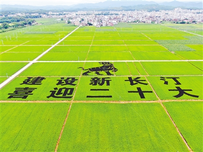 长汀县今年在河田镇实施“全国水稻绿色高质高效行动示范片”,该示范片涵盖8个村,共11600亩,选用优质稻品种,采用工厂化育秧、全程机械化耕作、测土配方施肥、绿色防控病虫害等技术,晚稻有望实现亩产480公斤的目标。图为近日拍摄的示范片田野上的稻绘。