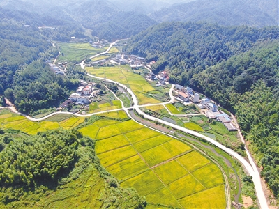 上杭县蛟洋镇邹坑村响应国家号召,牢牢把住粮食安全主动权,稳定粮食播种面积,今年将抛荒多年的耕地200亩全部种植优质中稻,不日即将收割,有望每亩实现产量450公斤。图为11日该村抛荒复垦中稻鸟瞰。 融媒体记者 傅长盛 摄