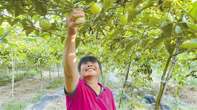 近日,郑秋才正在农场里采摘百香果。家住永定区西溪乡礼田村的郑秋才、谢才光夫妇成立了永定永丰家庭农场,承包了30多亩地种植“钦蜜九号”百香果。尽管今年天气干旱,但在当地农业农村部门的帮助下,百香果基地安全度过旱期,喜迎丰收。目前,其农场的百香果不仅价格卖得好,而且供不应求,预计今年产值可达65万元。