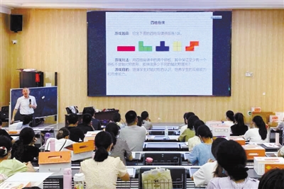 为提高学生数学核心素养,近日,龙岩市实验学校计划开展数学益智游戏课程,邀请特级教师任勇莅临学校进行数学益智器具培训。图为任勇老师讲解数学益智课程。融媒体记者 郭亦斌 通讯员 邹薇 摄