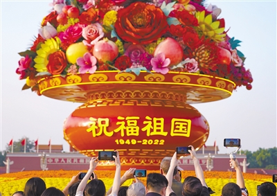 9月25日,游客在“祝福祖国”巨型花果篮前拍照。国庆节临近,“祝福祖国”巨型花果篮亮相北京天安门广场。