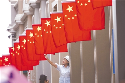 10月1日,一名市民在广西南宁市朝阳广场步行街与悬挂的国旗合影。当日是国庆假期第一天,人们以多种方式迎接长假,欢度佳节。 新华社发(喻湘泉 摄)