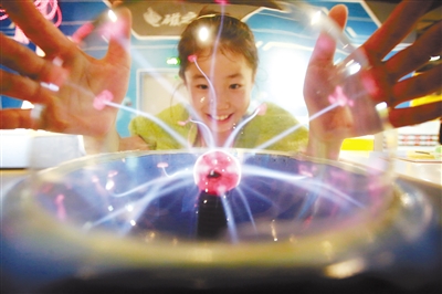 10月1日,在江苏扬州科技馆,小朋友在体验“辉光球”。当日是国庆假期第一天,人们以多种方式迎接长假,欢度佳节。 新华社发(孟德龙 摄)