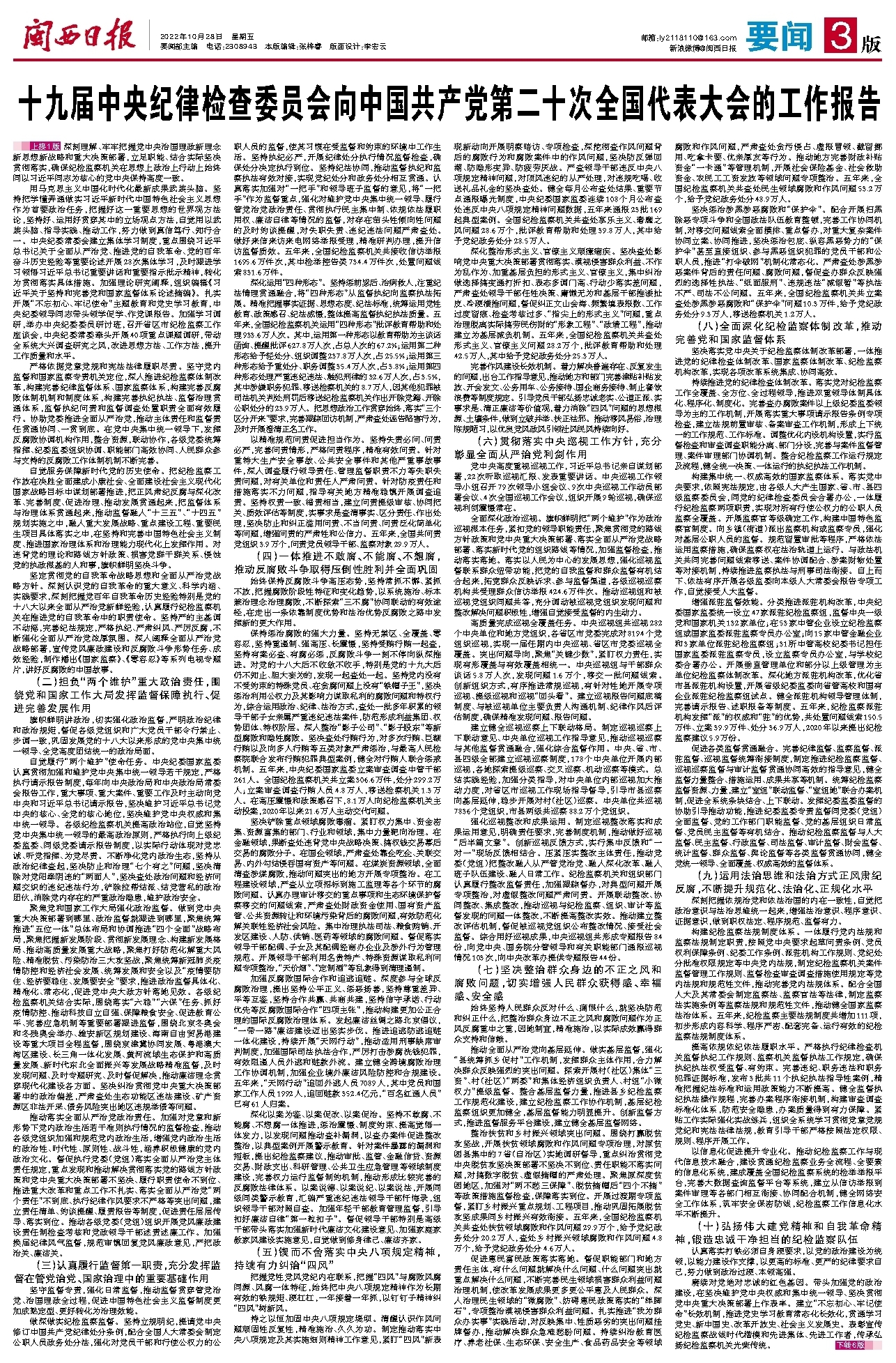 十九届中央纪律检查委员会向中国共产党第二十次全国代表大会的工作报告
