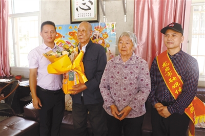 近日,市融媒体中心联合安勤财务公司组织志愿者前往永定龙潭联中村,看望慰问92岁高龄的抗美援朝老战士阙坤洪老人,给他送去慰问金和生活物品。图为慰问人员与老战士合影留念。融媒体记者 许文星 赖珊盛 摄