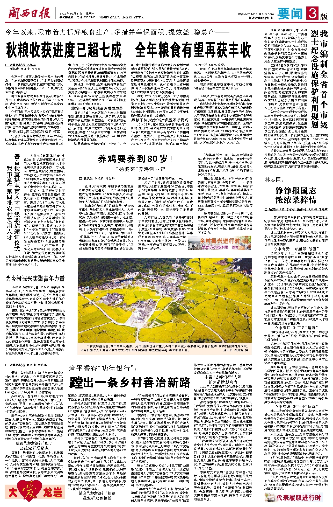 近年来,该村不断加强农村基层党组织建设,从德治角度出发,深化村民自治实践,试点设立“功德银行”,发动群众参与基层治理,妥善化解农村矛盾纠纷,维护农村社会和谐稳定,蹚出一条乡村善治新路子。就在去年,香寮“功德银行”的做法被龙岩市委乡村振兴办列为全市乡村振兴典型案例。