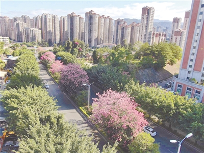 近年来,龙岩中心城区实施道路“彩化”工程,在莲庄路、龙腾南路、华莲路、东环路、龙岩大道、工业路等多条街道上种植上千株美人树,每到秋冬季节鲜花绽放,成为秋天里的城市“网红”花树。近两年园林部门又在西陂路、龙腾路、莲庄南路等种植大批美人树作为行道树,增加城市花木密度。图为日前东山片区莲庄南路今年首次蓬勃盛放的美人树。 融媒体记者 傅长盛 摄