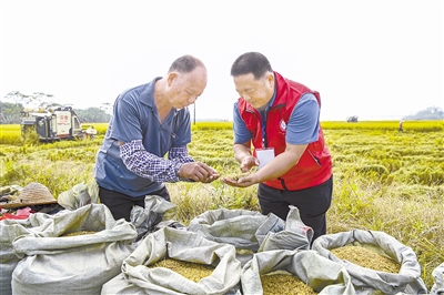 11月10日,在兴业县石南镇凤山村的稻田里,科技特派员(右)在查看晚稻品质。近年来,广西兴业县坚持人才下沉、科技下乡,组建专家团队,实现科技专家服务团对全县所有乡镇、科技特派员对所有脱贫村全覆盖。截至目前,兴业县科技特派员已进驻30多个创业示范基地,助力乡村振兴。 新华社 发
