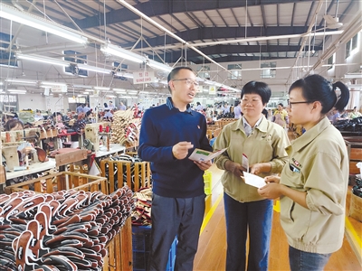近日,连城县法学会会员在庙前镇台商棒球企业宏国体育用品有限公司宣讲中共二十大精神。连城县法学会开展“学习宣传二十大,送法进企业,护航营商环境”系列活动,组织会员到企业宣讲党的二十大精神,宣传涉企法律法规、民营企业司法保护制度,全力营造法治化营商环境。 通讯员 黄水林 摄