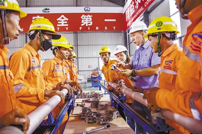 11月13日,在印度尼西亚万隆,印尼员工在中国中铁电气化局雅万高铁资源管理中心学习中国标准“简统化”接触网零部件装配工艺。作为“一带一路”倡议和中印尼两国务实合作的标志性项目,雅万高铁是中国高铁首次全系统、全要素、全产业链在海外建设项目。建设期间,中方持续加大对印尼员工的培训,扶持印尼组建一支自己的高铁技术力量和员工队伍,累计培训印尼员工达4.5万人次。 新华社发 (焦宏涛 摄)