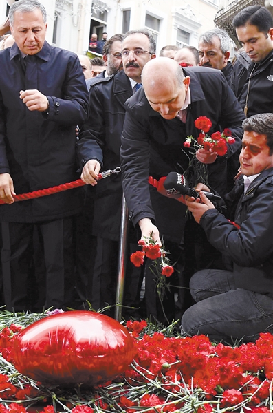 11月14日,土耳其内政部长索伊卢在伊斯坦布尔市中心塔克西姆广场边的独立大街爆炸现场献花以表哀悼之情。土耳其最大城市伊斯坦布尔市中心塔克西姆广场边的独立大街13日下午发生爆炸,造成至少6人死亡、81人受伤。土内政部长索伊卢14日表示,嫌疑人已被警方逮捕。 新华社记者 沙达提 摄