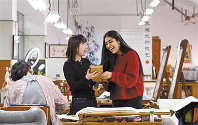 在天津杨柳青木版年画博物馆勾描工作室,天津杨柳青画社彩绘艺人王艳(中)与辛格就木版水印技艺交谈(11月17日摄)。1999年,5岁的辛格跟随父母从印度来到中国,在北京、天津等城市求学、生活。辛格十分热爱油画创作,在天津开设了自己的绘画工作室,从事绘画教学。她很喜欢学习新的艺术表达方式,在绘画作品中表达了浓浓的中国情。 新华社记者 孙凡越 摄