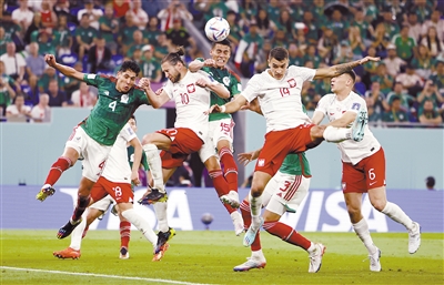 11月22日,墨西哥队球员埃克托尔·莫雷诺(右三)与波兰队球员克雷霍维亚克(右四)在比赛中争顶。当日,在卡塔尔多哈974球场进行的2022卡塔尔世界杯足球赛C组比赛中,墨西哥队以0比0战平波兰队。 新华社记者 王丽莉 摄