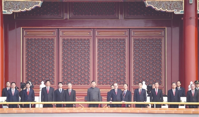 2019年10月1日,庆祝中华人民共和国成立70周年大会在北京天安门广场隆重举行。这是习近平同志、江泽民同志、胡锦涛同志等在天安门城楼上。