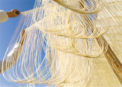 12月12日,在竹塘社区挂面合作社的挂面车间,工人将挂面上架晾晒。安徽省合肥市肥东县桥头集镇竹塘社区手工制作挂面历史悠久,是远近闻名的挂面专业村,手工挂面制作技艺是当地非遗项目。近年来,当地采取“合作社+农户”模式,统一挂面制作标准,除挂面车间集中生产外,还指导分散的农户生产,统一收购、销售。通过大力发展特色手工挂面产业,增加农户收入,助力乡村振兴。