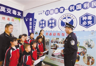 近日,连城县四堡镇4所小学统一开展校园禁毒教育活动。在林则徐禁毒宣教室,公安民警通过展示摇头丸等10余种实物标本,对师生讲解毒品的特点、危害及如何识毒、防毒与拒毒等知识。 通讯员 邹善水 黄美华 摄