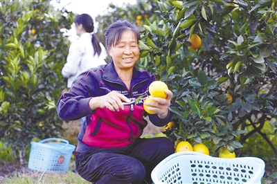 近日,上杭县湖洋镇文光村观音井万亩果园,每到周末都迎来采摘休闲的游客,该村100多户种植户种植的果树主要有台湾蜜雪梨、蜜柚、脐橙等,采摘经济撑起了文光村的小康之路。图为种植户范文英正采摘脐橙供应市场。 融媒体记者 傅长盛 摄