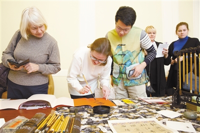 1月30日,在俄罗斯圣彼得堡凯瑟琳礼堂,当地市民体验中国书法。近日,俄罗斯第二大城市圣彼得堡举办系列活动庆祝中国春节。 新华社 发