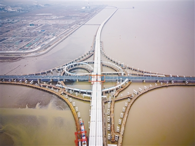这是2月1日拍摄的杭甬高速复线一期工程滨海互通(无人机照片)。连日来,在杭甬高速复线一期工程现场,工人们顶着海风加紧施工建设,现场一派繁忙。杭甬高速复线一期工程全长约55.833公里。 新华社记者 江汉 摄