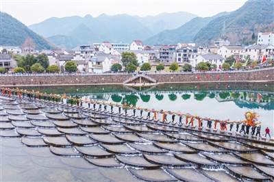 2月1日,窈口村女子板龙队在湖源乡的龙鳞坝碇步桥上进行舞龙表演(无人机照片)。当日是农历正月十一,在梅花锣鼓的伴奏下,浙江省杭州市富阳区湖源乡窈口村女子板龙队举起由50余张板凳连起来的百米板龙舞动起来,拉开了湖源乡新春系列迎元宵活动的序幕。作为杭州市富阳区非物质文化遗产,湖源乡窈口村女子板龙有200多年的历史,寄托百姓对风调雨顺、五谷丰登的美好愿望。 新华社记者 徐昱 摄