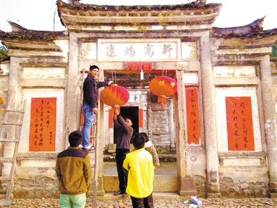 腊月廿九,长汀县馆前镇沈家大院社区举行了一场写春联、挂灯笼、贺新年活动,沈家大院的村民们家家户户挂灯笼、贴春联,一副副对联表达村民对新春的期盼和祝愿,迎接兔年新春的到来。图为村民在沈家大院挂灯笼迎新年。 通讯员 黎寿钦 摄