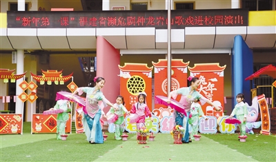 7日上午,龙岩市实验幼儿园开学第一课开展了“福兔迎春·幼有福气”迎新活动。活动包括“非遗”采茶灯表演、投壶、套圈、拓印年画、写“福”字等,小朋友们以“游戏”的方式参与到活动中,既是对优秀传统文化的继承与发扬,亦是对新学期的新期盼。图为小朋友们学习采茶灯表演。 融媒体记者 郭亦斌 通讯员 陈萍 摄