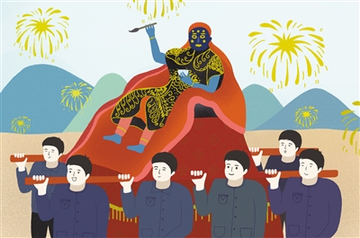 魁星,魁星来了!人群中爆发出一阵阵欢快的叫喊。只见他身披朝服,在八抬大轿上正襟危坐,狰狞的面具下一双星目炯炯有神。左手端着一方砚盘,右手握着狼毫,凝神屏息,似在构想着江山锦绣文章。传说他满腹经纶,三度折桂,却因丑陋不堪,被皇帝拒绝钦点状元。怀才不遇报国无门的他最后愤而投江,却被神龟救起,震慑了以貌取人的皇帝,最终青云直上。人们敬佩他的才气,为他的百折不挠而感动、艳羡,从此奉他为魁星。每年“走古事”,人们竞相争当魁星,以祈家门昌兴。