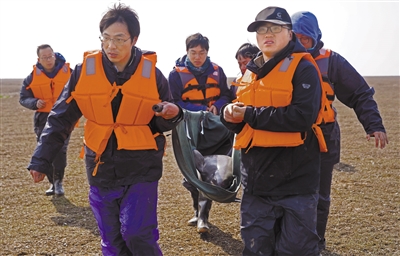 在江西鄱阳湖松门山水域的滩涂上,工作人员在转运江豚(2月15日摄)。江豚是长江水生生物保护的旗舰物种,国家一级重点保护野生动物,种群极度濒危。由于2022年长江中下游旱情影响,江西鄱阳湖松门山水域砂坑中有超过30头江豚难以游入航道深水区。为降低江豚搁浅、食物短缺等潜在风险,促进长江流域种群结构优化,丰富遗传多样性,江西省农业农村厅与中国科学院水生生物研究所等部门,近日在鄱阳湖松门山水域联合开展长江江豚迁地保护行动。此次行动计划安全捕捞8头江豚,分别迁移至湖北、安徽和江西湖口的长江江豚迁地保护区。 新华社记者 万象 摄