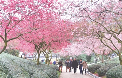 每年二月至三月,永福樱花进入盛开期,上万株樱花连片开放,满园绯红,如云似霞,游走其间,目不暇接,构成一幅美不胜收的樱花盛景。漳平市永福镇内种植了10万株樱花,品种丰富,主要有中国红、绯寒樱、云南樱、染井吉野樱等40多种。图为15日游客在茶绿樱红中尽享春天的浪漫之旅。 融媒体记者 傅利昌 摄