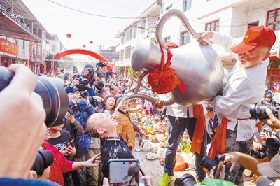 21日,春光明媚,在长汀县濯田镇升平村,汀台保苗文化艺术节暨百福进万家民俗活动在这里举行。活动现场,省级非物质文化遗产——长汀濯田升平村“百壶宴”民俗活动火热进行,盛况再现。据悉,保苗节、百壶宴在该村年年举办,但今年活动不一般,首次迎来了台湾民俗文化交流团一行60人共同参与。图为“百壶宴”现场。 通讯员 陈天长 邱嘉瑞 摄
