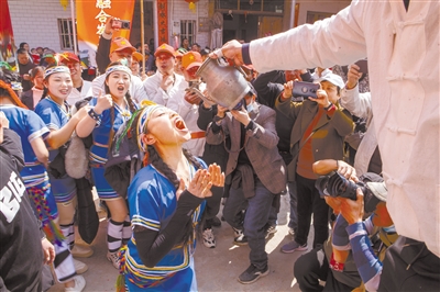 今年的“百壶宴”首次迎来了来自宝岛的台湾民俗文化交流团,村民用美酒招待台胞。