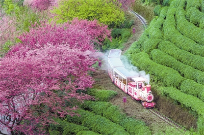 去年底建成的樱花大火车在花草树间穿行,等到三四月份观赏希望的田野:漫山的金针花海、杜鹃花谷等美丽景致,这里将打造成为“四季有花”“四季常青”生态多样性保护修复样板。不仅能近距离感受身边美景,还能远距离欣赏台品樱花茶园的风姿,从景区外围观赏整个台品樱花茶园,又是另一番景象,这一巧思,让人啧啧称赞。