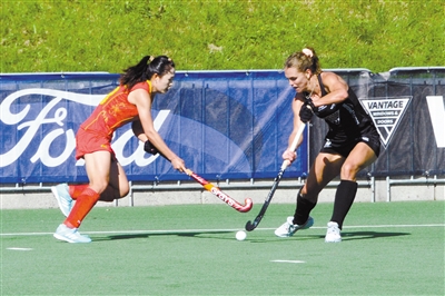 2月26日,中国队球员邹妹容(左)在比赛中拼抢。当日,在新西兰惠灵顿进行的曲棍球世界女子超级联赛中,中国队以5比2战胜新西兰队。 新华社记者 卢怀谦 摄