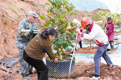 据了解,近年来,永定区峰市镇河头村依托龙湖独特气候环境,种植了莲雾、四季龙眼、树葡萄等20多个特色水果1000多亩,同时,在市派干部帮扶推动下,依托省级乡村振兴项目、观光采摘、乡村旅游和电商平台,让莲雾产业更好地融入乡村振兴建设中来,真正成为带领群众增收致富的绿色产业,把绿水青山变为源源不断的金山银山,助力果农增收。图为村民们正抢抓农时开展莲雾树苗种植。